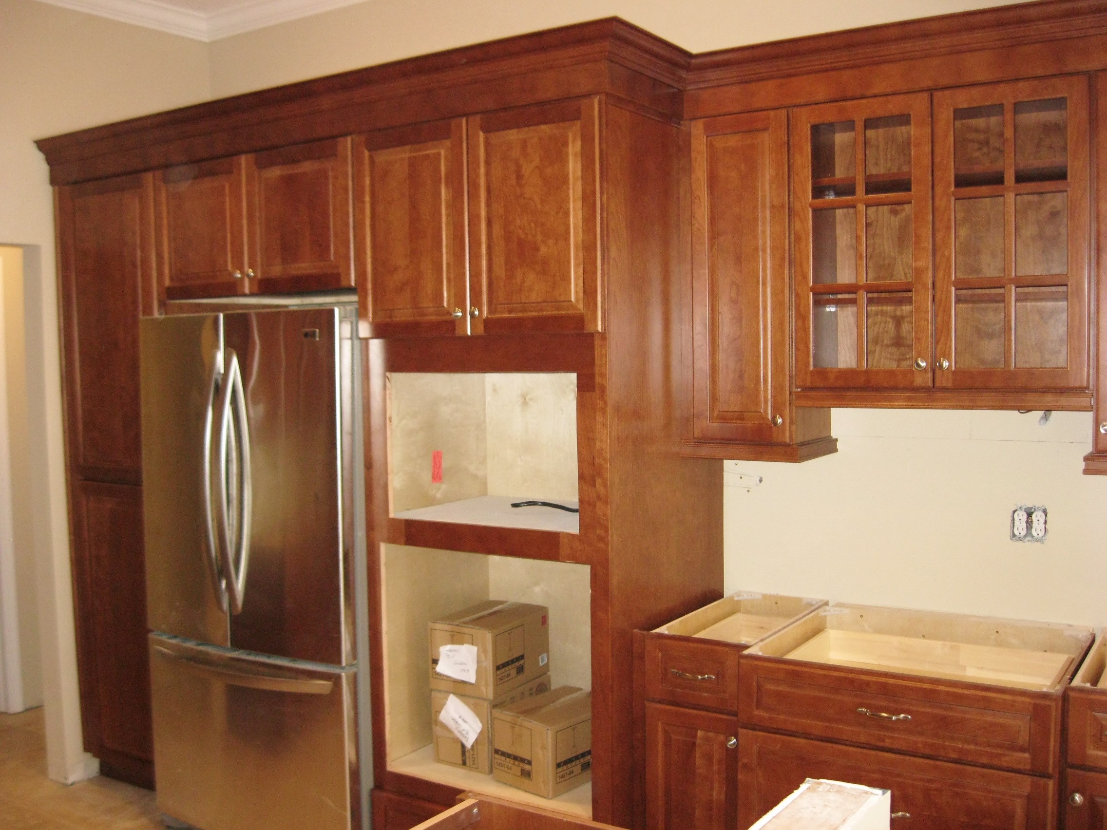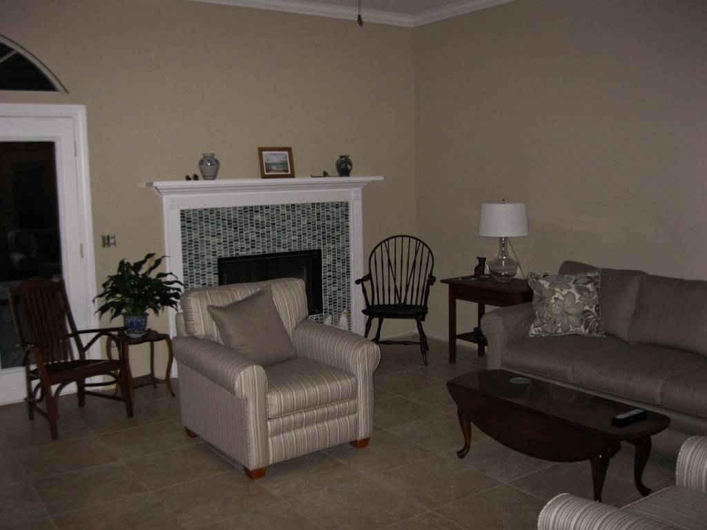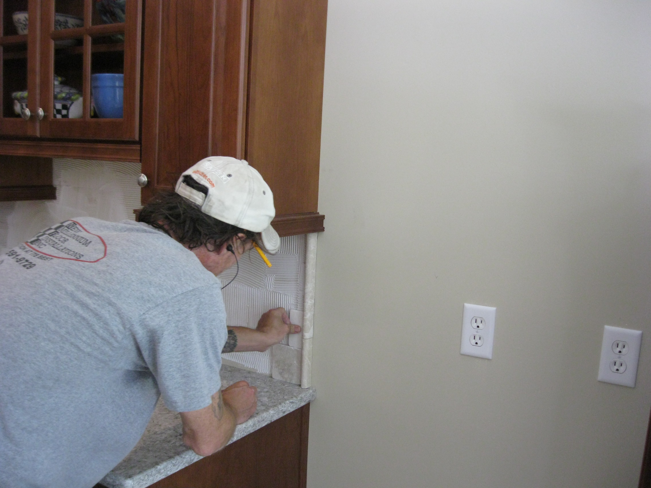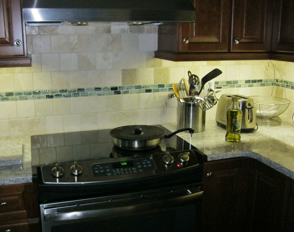 The kitchen tile back splash is completely finished and looks beautiful. Pictures have the glass tiles looking green but they are more like sea-glass blue.