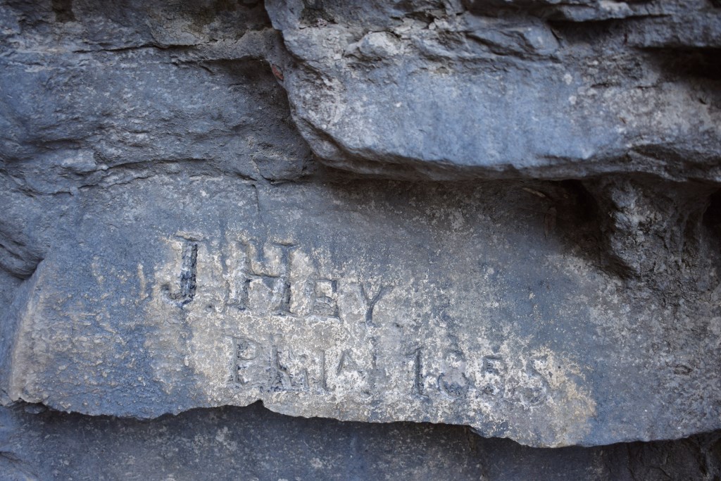George Washington’s initials, Natural Bridge (carved about 1/3 from top, outlined in white chalk)